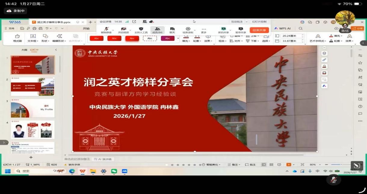 为精准提升学生翻译竞赛实战能力,引导学生合理规划寒假学习生活,2026年1月27日下午,学院通过腾讯会议成功举办翻译备赛经验分享会。本次分享会特邀全国翻译竞赛一等奖获得者冉林鑫学长担任主讲嘉宾,陈钰副院长出席并致辞,共吸引百余名学生线上参与,现场学习氛围浓厚。