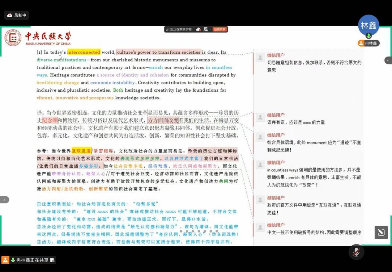 会议伊始,陈钰副院长发表开场致辞。她对线上参会的同学们致以热烈欢迎,着重强调翻译竞赛是检验专业知识储备、锤炼语言应用能力、拓展国际视野的重要平台,鼓励同学们以此次分享会为契机,主动汲取优质经验、潜心打磨专业技能。她指出,学院搭建此次交流平台,旨在为同学们理清备赛思路、凝聚学习合力,希望大家珍惜难得的学习机会,在互动交流中有所收获、有所成长,未来能在各类翻译赛事中脱颖而出,充分展现一师学子的专业风采。