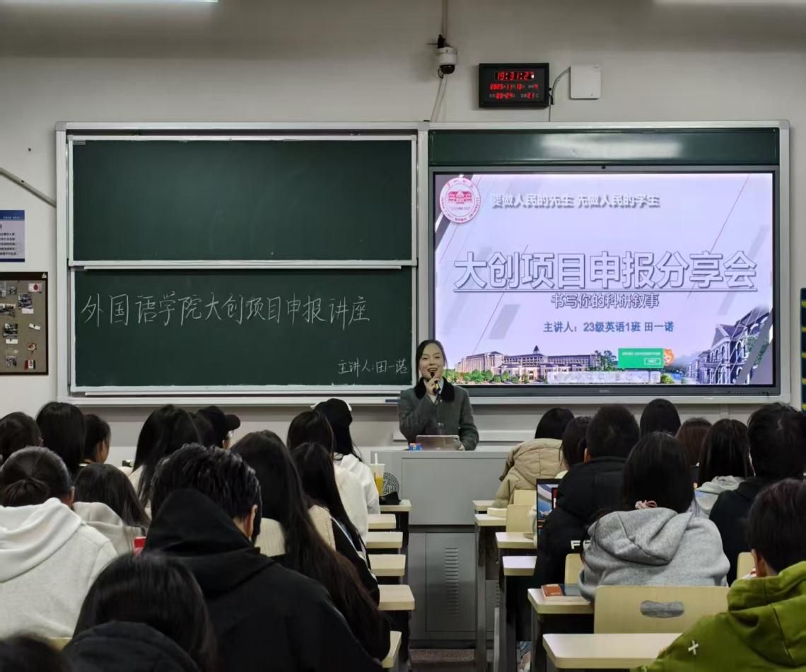 为帮助大一学生明晰大学生创新创业训练计划(简称 “大创”)申报流程,提升科研创新能力,11 月 13 日晚,外国语学院在图书馆 203 教室成功举办大创项目申报分享会。2023 级英语 1 班田一诺同学担任主讲,100 余名大一学生到场聆听学习。