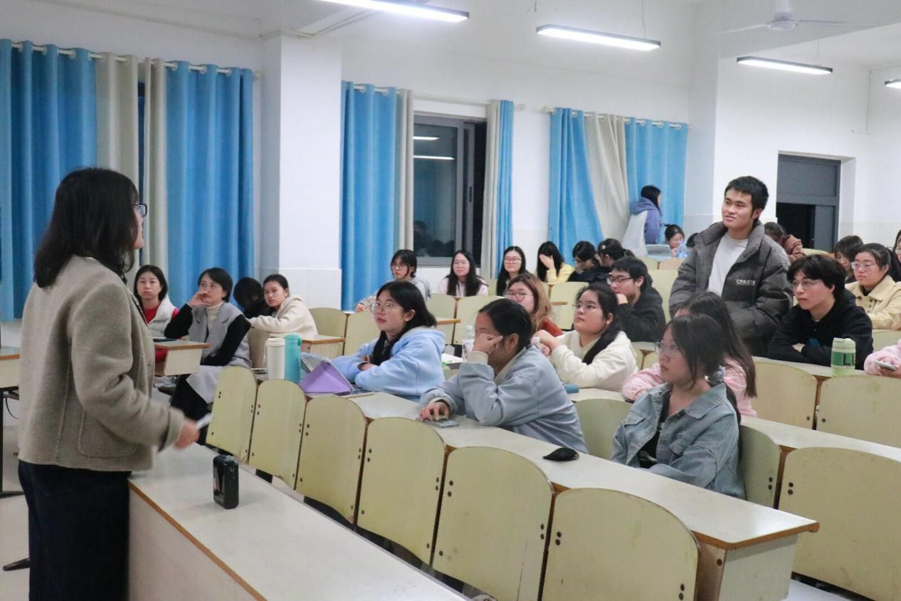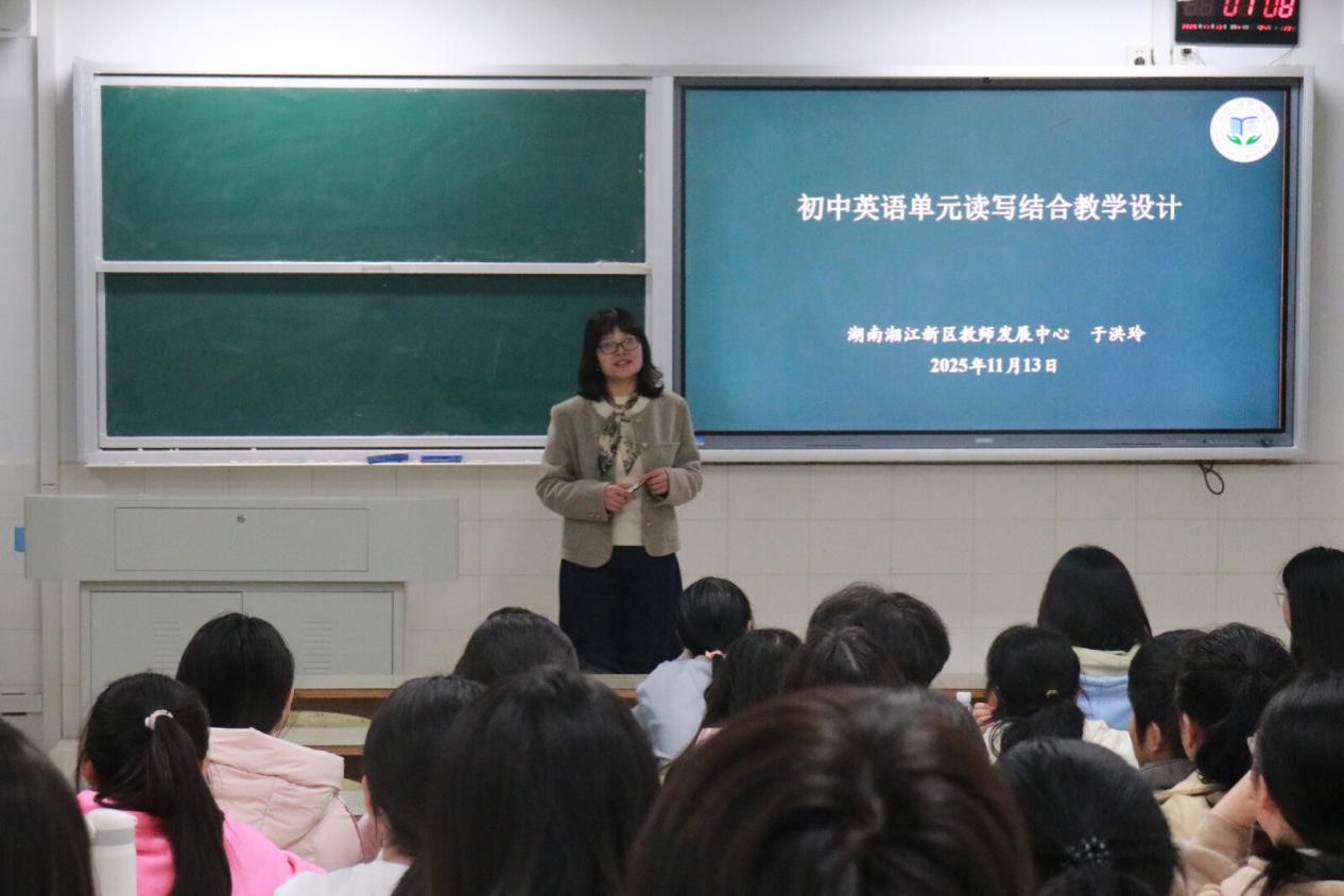 为提升师范生英语教学设计与实践能力,11月13日晚7点,我院“润之英才名师讲堂”第七讲在东方红校区玉衡北110顺利举行。本次讲座特邀湖南湘江新区教师发展中心中学英语教研员、高级教师于洪玲担任主讲,围绕“初中英语单元读写结合教学设计”展开深度分享。讲座由外国语学院党委委员陈喜贝主持,23、24级润之班全体学生到场聆听。