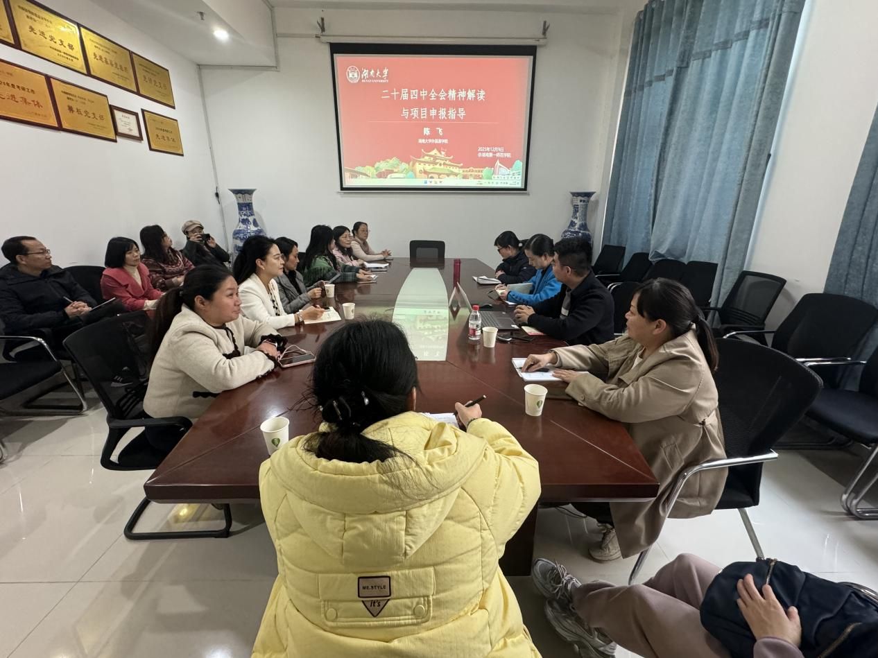 12月9日下午,应学院邀请,湖南大学外国语学院教授、博士生导师陈飞来我院做党的二十届四中全会解读和高级别项目申报指导。副院长陈钰、学术院长陈圣白和2026年拟申报高级别项目的学院教师参加了本次指导会。会议由副院长王佳娣主持。