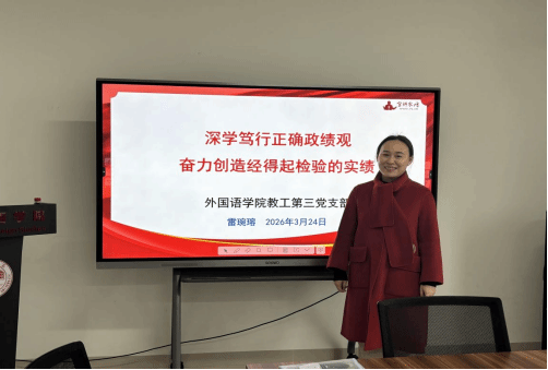 为深入学习贯彻习近平新时代中国特色社会主义思想和党的二十大精神,落实上级关于树立和践行正确政绩观的工作部署,外国语学院教工第三党支部于2026年3月24日组织开展了“树立和践行正确政绩观”专题微党课学习。支部书记雷琬瑢同志主讲,学院党委书记何培森同志及联系本支部的党委委员陈喜贝同志出席指导。