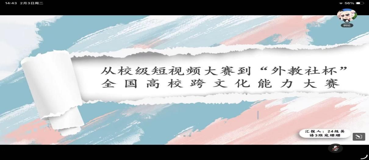 为提升学生新媒体创作能力与跨文化传播素养,助力学子高质量备战省级、国家级大学生短视频竞赛,2026年2月3日下午,我院通过腾讯会议线上举办短视频竞赛备赛经验分享会。会议由向红博士主持,24级英语3班宛姗姗同学担任主讲嘉宾,学院众多意向参赛学子齐聚云端,共学创作技巧、交流备赛心得。