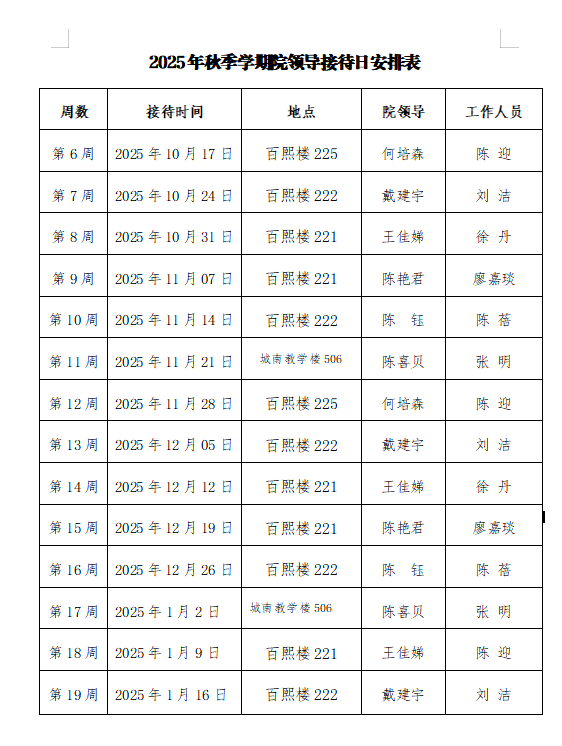 为继续做好院领导接待日工作,汇聚广大教职工智慧,及时解决师生合理诉求,更好推动学院发展,现就2025年秋季学期相关工作安排通知如下: